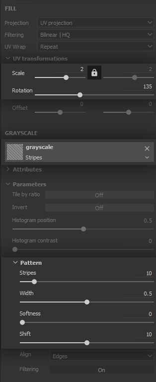 For building the first level of stripes, we will use a * Fill* Effect with a Stripes pattern - duh! This Effect is set with a Linear Dodge (Add) blending mode, in order to add visible portions to the mask (i.e. white).