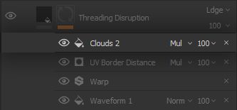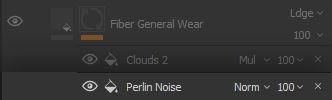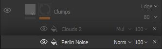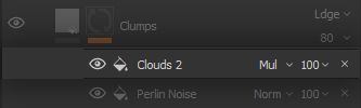 The Clouds 2 noise is very versatile for its good low-frequency separation and mid-frequency graininess without much high-frequency noise, it will therefore be used multiple times throughout the project. The noise is set to a Multiply blending mode, since we will use it to remove large portions of the clumps visibility.