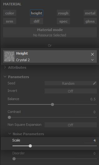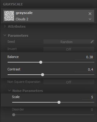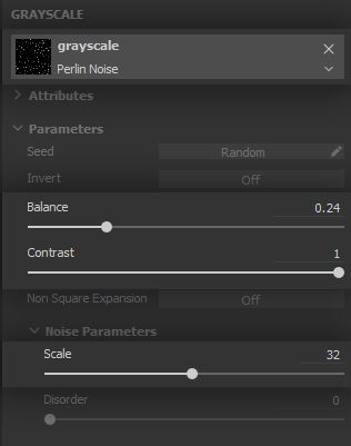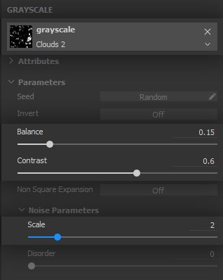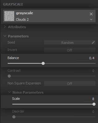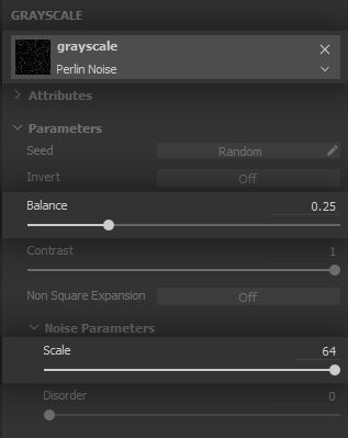 The noise needs to let only a few areas appear, and these need to be well defined, so the clumps appear both solid and varied. The balance will therefore go down and the contrast is pushed to its maximum - again, we will let texture filtering provide the blurriness required for smooth height variation.