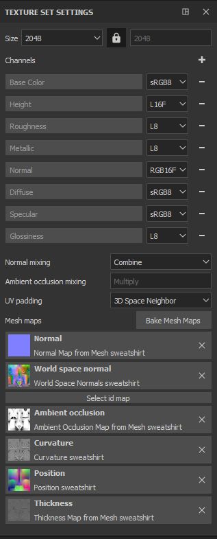 You can check that your resolution, texturing channels and mesh maps are all set up correctly in the ‘ Texture Set Settings ’ windows, as shown below. If anything is missing or incorrect, you can do any adjustments and additions in this panel.