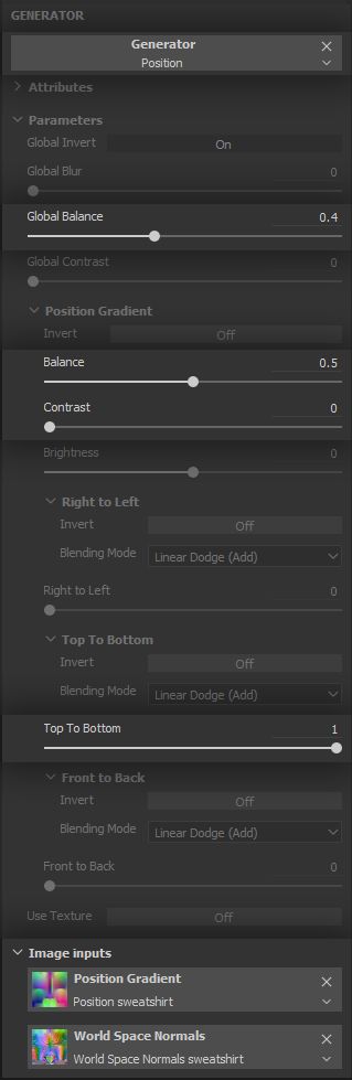 To use this mesh map, we add a Generator Effect to the mask and set it to Position. Notice the mesh maps inputs at the bottom of the parameters panel. The most important thing to do here is setting the Top to Bottom direction range to 1 and leaving all other direction ranges at 0, so as to isolate the vertical gradient. From there the couple of Balance parameters, in combination with Contrast should provide all the control we need on the maximum height the folds should appear. Of course, you can break this up further by subtracting a noise in a * Fill* Effect on top of the vertical gradient.