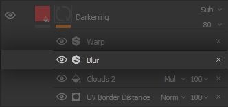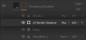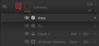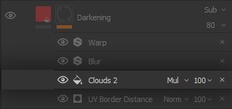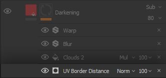 We create a black mask and get to work on placing this darkening in the proper areas, starting with the powerful * UV Border Distance* Generator Effect to leverage those clever UVs we laid out. The generator does pretty much what it says: it creates a white outline on the UV borders, with a tweakable distance and fade.