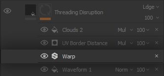 To emulate the back and forth of the sewing process, we need a mask which features a back and forth between black and white. Fortunately, we have toyed around with such a tool for a while in this project: it is good to see you again, Stripes ! By using a ‘Stripes’ pattern with a very high amount of tiling, a high contrast to keep a good definition, and any random angle value, we use the warp in a way which displaces the lines back and forth. The result combines with the tri-planar projection and criss-crosses the lines into themselves, we quickly created our threading structure in a way not too different from actual sewing!