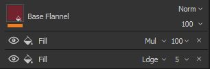 Furthermore, we also have to think about how the pattern is going to interact with the base fabric. We might want to have the pattern colours react to changes in the colours of the base fabric, so as to make overall hue changes seamless, for instance. For this reason, we fill the Layer with a colour, and set the colour blending mode to Subtract, so we can have the pattern colour be a tinted shade of the base fabric.