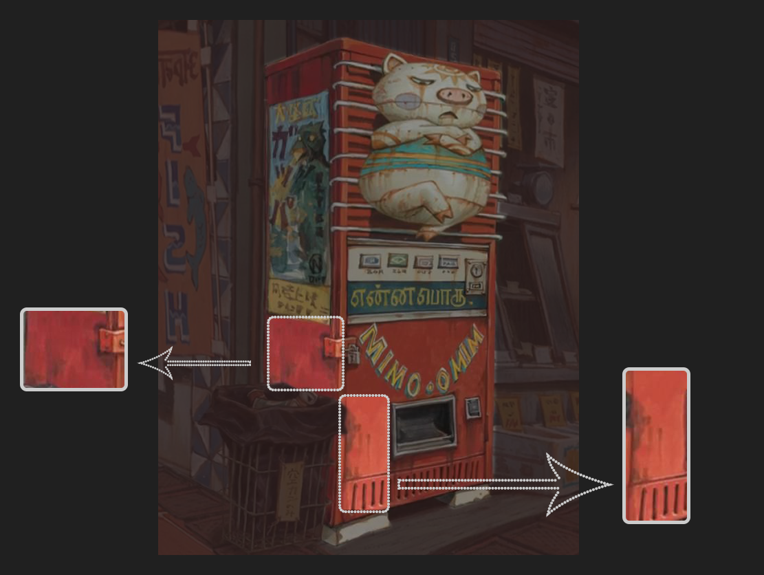 While I'm browsing my mood board, I make sure to define some characteristics that will inspire my future texturing, such as a color palette - the level of details - the shapes defining the color variations etc. After that I determine what should be done in Substance Designer and what should be done in Substance Painter.