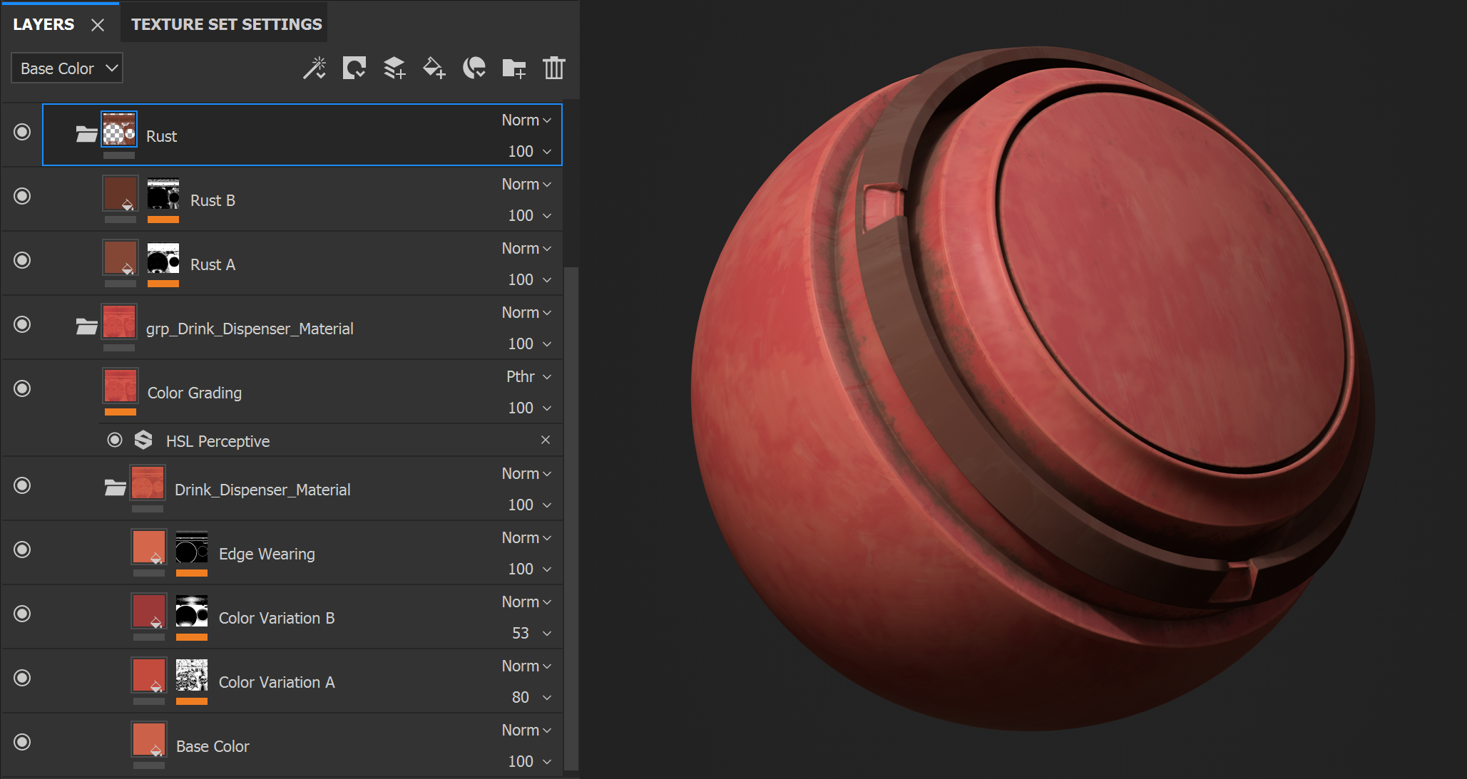 My Base Material created with Fill Layers is now done, and because it's only driven by procedural content such as Mask Generators and Procedural Maps I can now save my layer stack as a Smart Material and use it in another project. To create a Smart Material you have to put all your layers in a Group and then right click > Create smart material