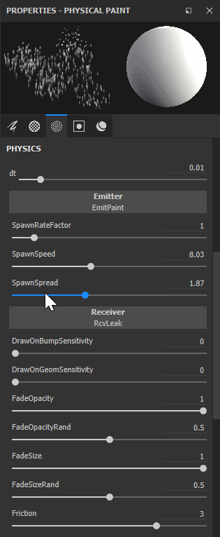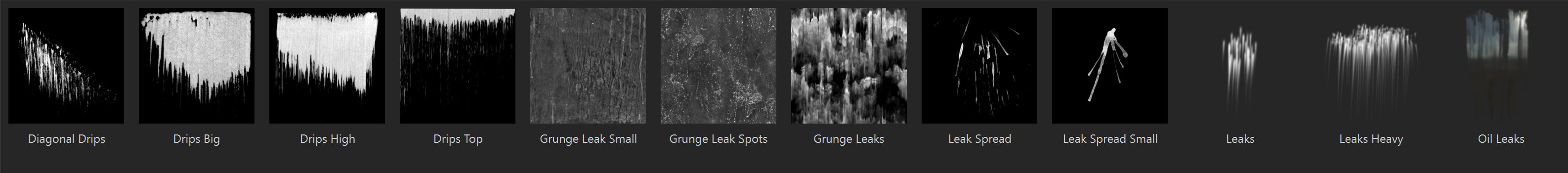 For the leaks, nothing is better than the Physical paint tool. I started from a preset and then I changed some parameters such as SpawSpread, Friction, ParticleLife. NB: Thanks to the Brush Preview window you can previsualize your Brush in real-time when tweaking.