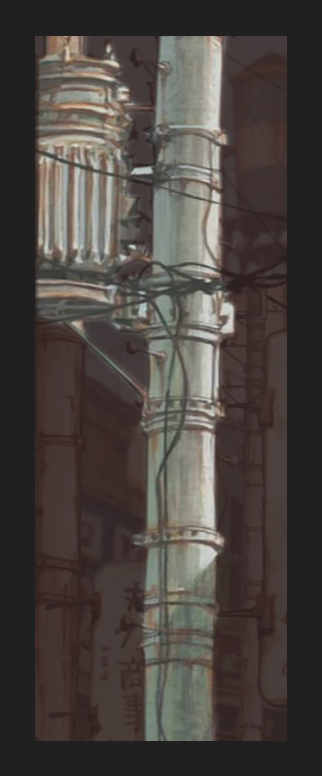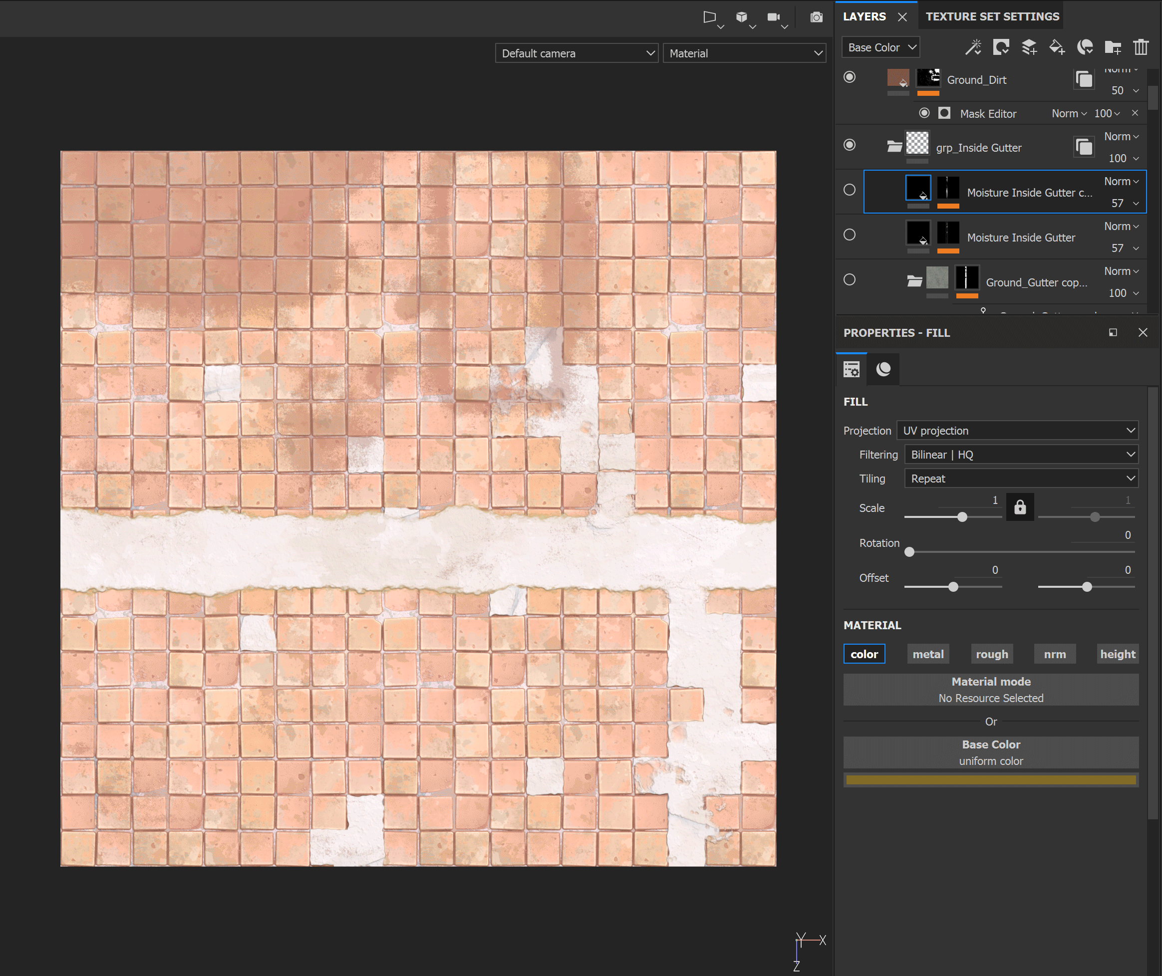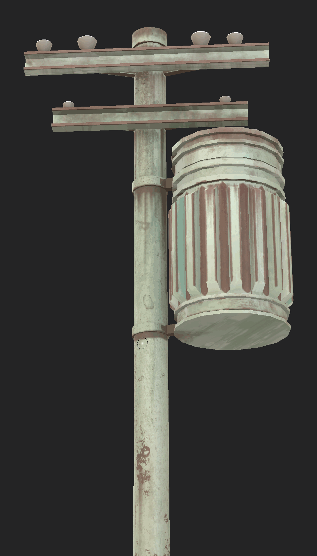 For this project, I started from photorealistic Painter materials for only two things: concrete of the gutter and metal of the electric pole. Otherwise I started from scratch with Fill layers, used Substance Painter's procedural noises and reduced the high frequencies.