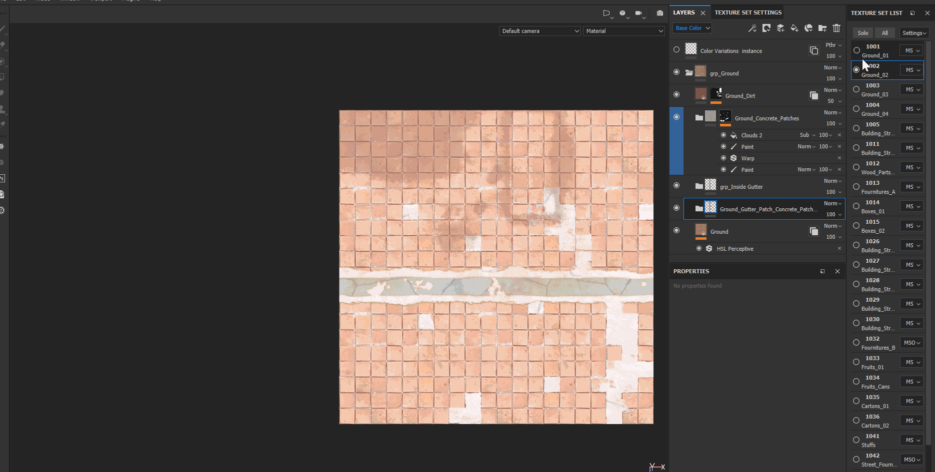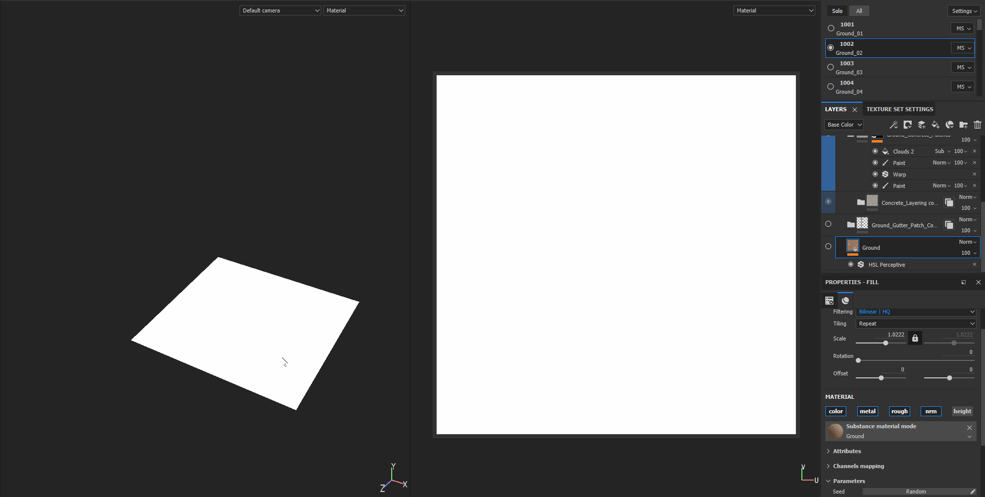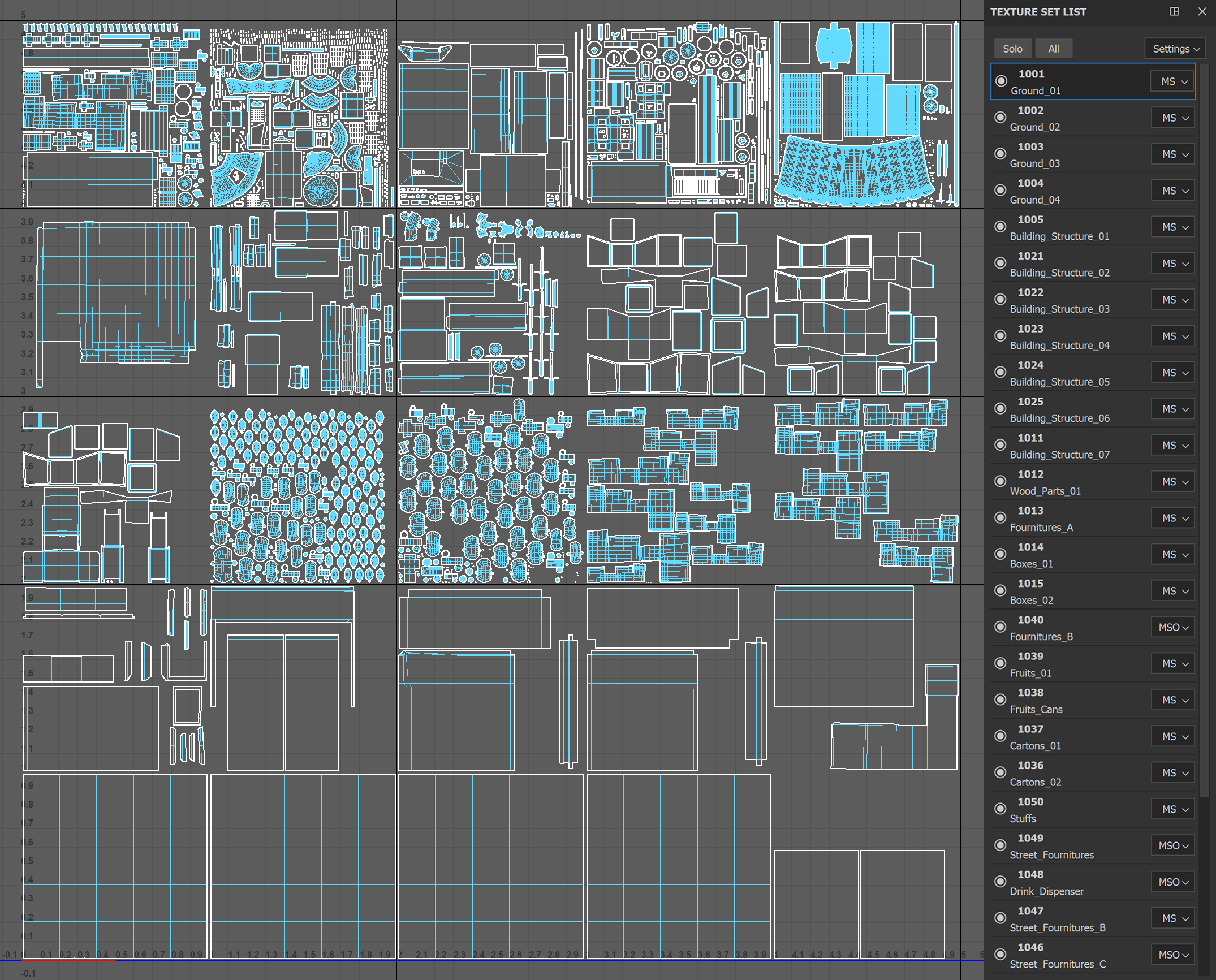As the ground is a larger part of the mesh, I'm going to split it into four UDIMs. Thanks to the Instancing feature, I just need to work on a single Texture Set and Instantiate my group of layers across the other ground Texture Sets.
