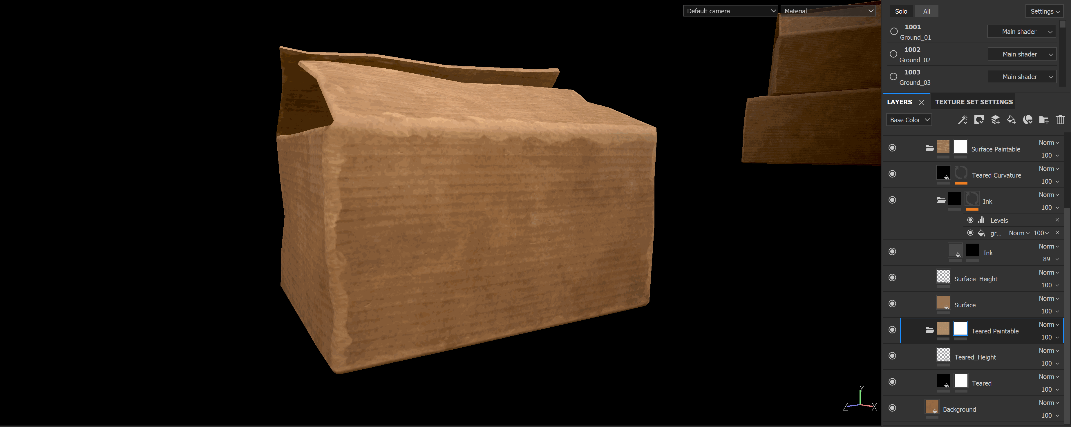 Four texture sets for one object is a good optimisation regarding texel density, but it's very complicated to manage in terms of texturing because now for one material (Ground material) I have to deal with several texture sets instead of one. Thanks to the Instancing feature I just have to work on a single Texture Set and Instantiate my group of layers across the others which means I can now work and modify only one texture set and instantly see the result without going back and forth.
