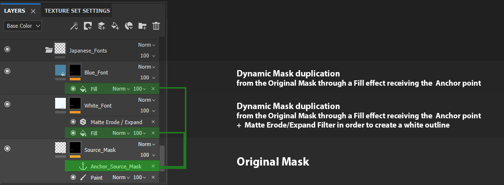 In my example, I'm going to use a source layer that I'll name "Source_Mask" From that layer, I'm sending my painting in two layers. The Blue one receives my painting without any post effects, it's basically a perfect duplication of my source mask. The White one just below receives my painting and a Filter called Matte Erode / Expand filter in order to extend my shape and then add outlines.
