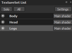 After importing the model with UDIM's in Substance Painter, we got three texture sets, renamed in accordance with the different parts of the body.