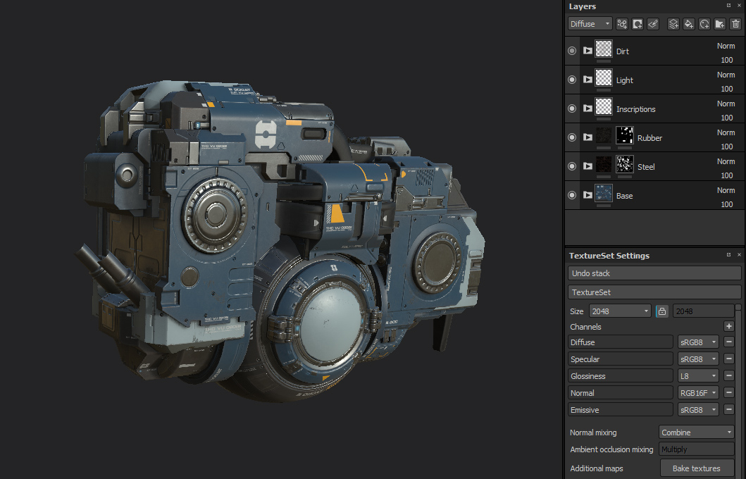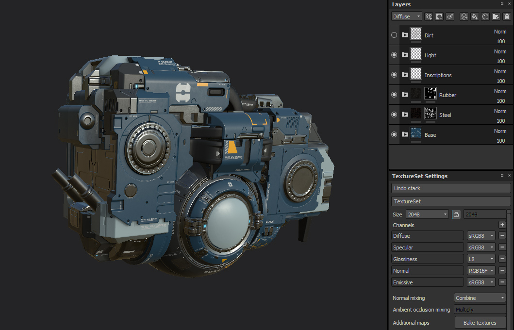 Then we added a couple of layers with the inscriptions and a separate layer with an emissive channel for the glowing elements.