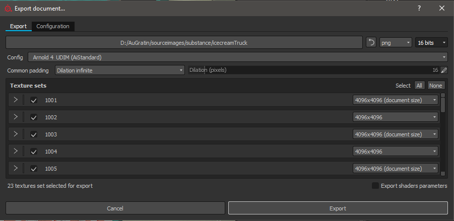 Now for exporting to Maya! I’m currently using 2017 with Arnold 1.2.4.4. I still have a lot of projects going with this older version, so this is why I'm using the "Arnold 4 UDIM (AiStandard)" config option on personal projects. I also prefer 16-bit png files. This workflow, however, is very similar to Arnold 2.0 + with Maya’s fairly new Color Management workflow. Because I’m going to be using this for a short, and will be rendering it from multiple angles, I’m exporting all channels out at 4K.