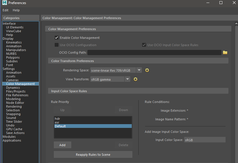 Great, all the files are now exported so the first thing I want to check in the Maya scene is that Color Management is enabled. You can find this option in Windows->settings/preferences->preferences, color management tab. I have found that if you created the file in an older version of Maya, this is off by default. If this is a fresh scene, it should be on by default.