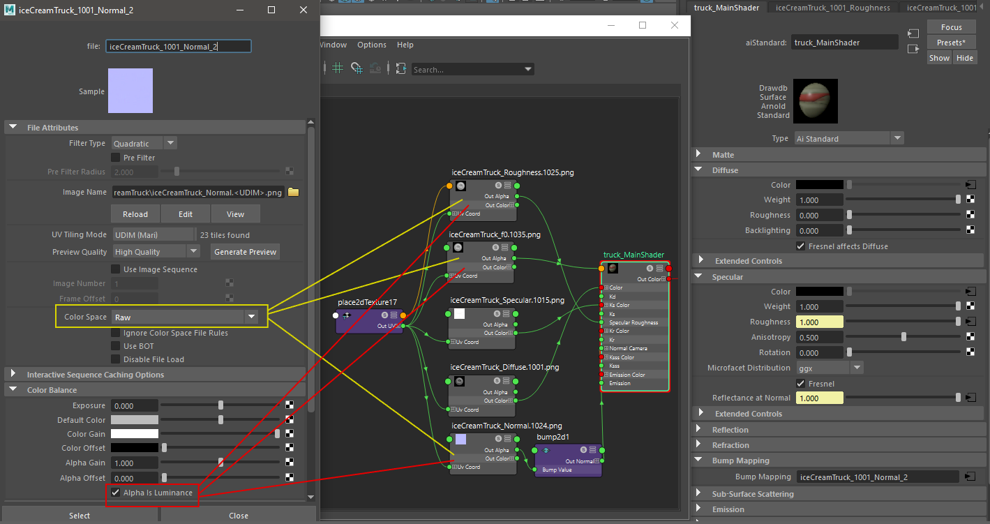 First, I create an aiStandard shader. Because I exported all texture sets with the UDIM workflow, I currently only need to make one shader and flip all my UV tiling mode settings to "Mari" so it creates the code in my aya texture file path. SP’s Diffuse to Color. SP’s Specular to Spec Color. SP’s Roughness to Roughness. Check “on” Fresnel and plug SP’s f0 to Reflectance at Normal. SP’s normal to Bump Mapping (switch bump node to “tangent space normals”) *If you’re using Arnold 2.0 and above, there is now a “aiNormalMap” node that can replace the bump node. It’s great because it has a strength slider which the Maya bump node is lacking.