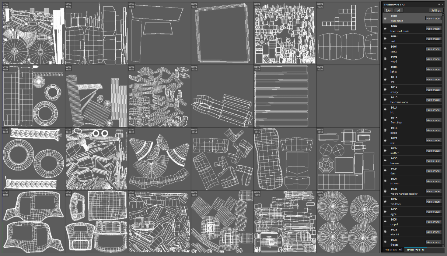 Next up: UVs. I laid them out so "like materials" are in the same texture set AKA tile: all wood, all plastic, all metals, and so on.