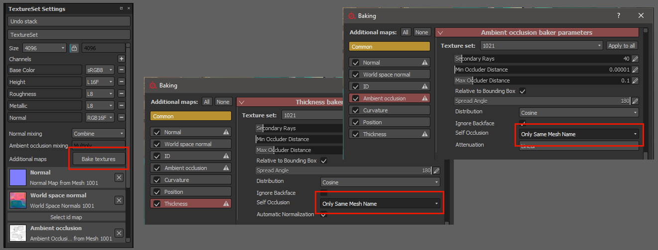 Pro tip before baking: If this is going to be animated I make sure to switch both Thickness and Ambient Occlusion to "Only Same Mesh Name" so there isn’t dirt painted where an asset might be moving.