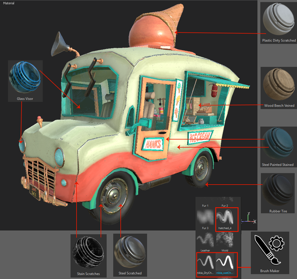 Shoutout to Gaetan Lassagne from Allegorithmic for this hatch brush (https://share.allegorithmic.com/libraries/136 ) that I use all the time! I also used brush maker (located under the alpha shelf) to make two sketchy brushes. One looks like a wet charcoal and the other a dry charcoal.