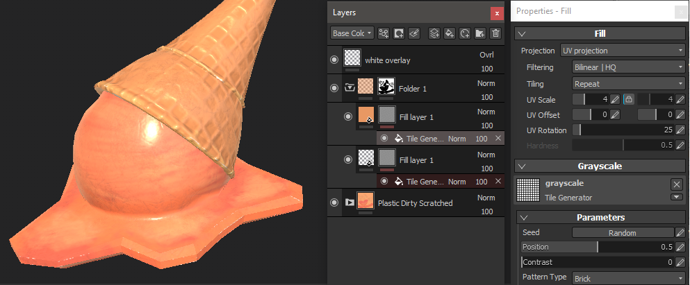 It was pretty easy to create the cone pattern using this tile generator set to brick for height and color. You can also see the white overlay here at the top of the layer stack for some sketchy detail.