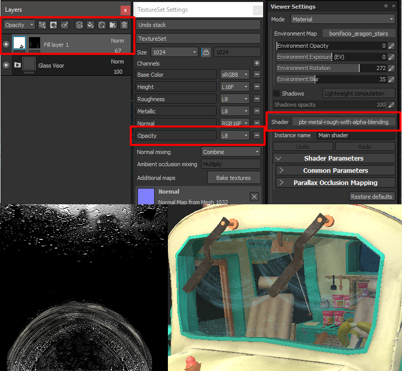 Now I have the ability to create a new fill layer with only opacity, height and color active. I then created an alpha in Photoshop and used that to project through a mask on the fill layer. This created the look of streaks on the windshield and dirt/drips on the windows.