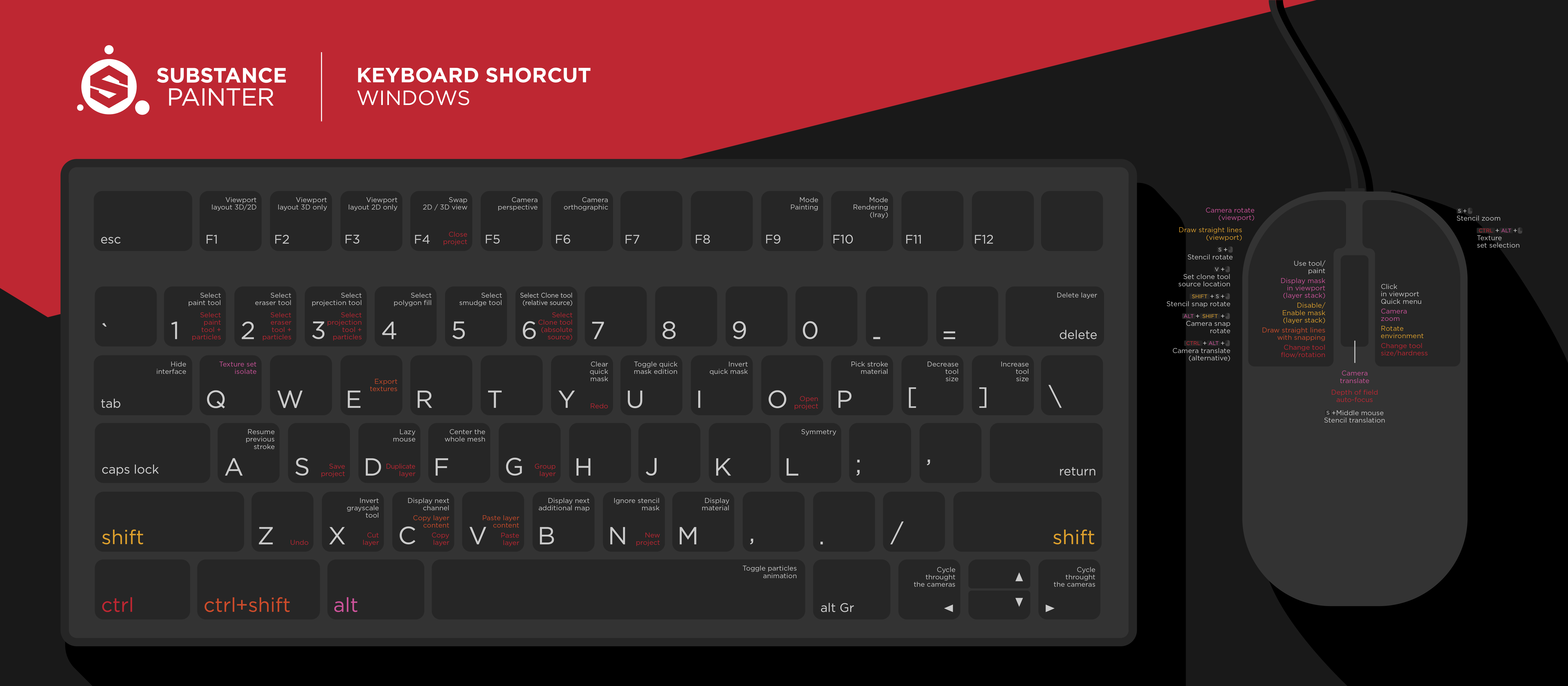 You can use keyboard shortcuts to become more productive in your work with Substance Painter. Don't hesitate to download the pdf versions to have them on hand. They are available for PC and for Mac.