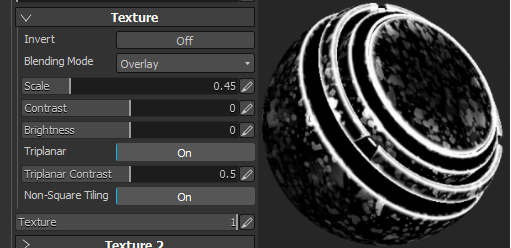 Open the " Texture " group to change the scale parameter and enable the tri-planar projection. This will improve the effect of the noise :