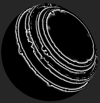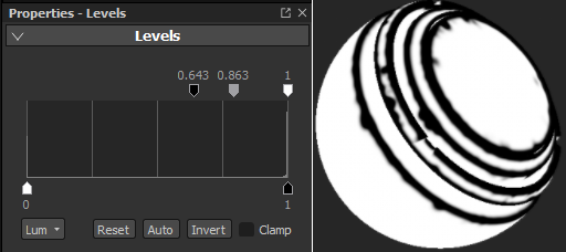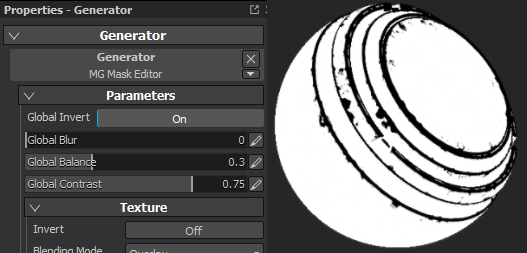Finally, we need to contrast the mask and invert it to make the Paint visible everywhere except on the edges of the geometry. To do so, we can reduce the "global balance" parameter and crank up the "global contrast", then enable the "invert" setting :