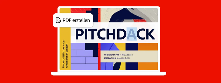 Illustration eines Laptop-Bildschirms mit einem farbenfrohen Pitchdeck und dem Text „Pitch Deck“, das von Bodea Inc. für Townsend Inc. erstellt wurde. Das Tool „PDF erstellen“ wird angezeigt.