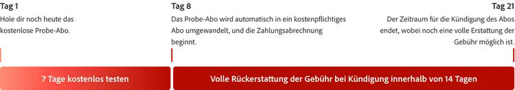 Das kostenlose Probe-Abo beginnt am Tag deiner Anmeldung. Am Ende des Testzeitraums wird deine Zahlungsmethode belastet, sofern du nicht kündigst. Wenn du vor Ablauf deiner Testversion kündigst, werden keine Gebühren erhoben. Nach Ablauf der Testversion kannst du Acrobat weiterhin nutzen, um PDF-Dateien ansehen, kommentieren und ausfüllen zu können. Um wieder auf Premiumfunktionen zuzugreifen, musst du Acrobat kaufen.