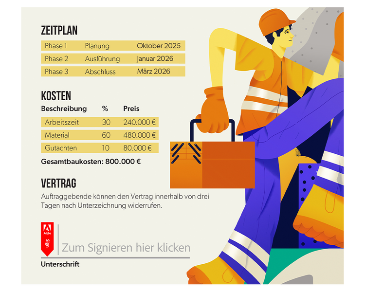 Erstellt personalisierte Angebote und Verträge, indem ihr Inhalte individuell anpasst oder kombiniert. Gebt sie zur internen Prüfung und Genehmigung frei, und verschickt sie zur elektronischen Unterzeichnung.