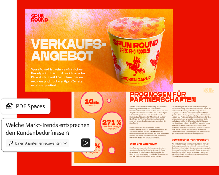 Smarter arbeiten mit KI-gestützten Funktionen, die euch dabei helfen, aus Dokumenten wertvolle Erkenntnisse zu gewinnen und eure Ziele schneller zu erreichen. (Verfügbar in Acrobat Studio oder mit dem KI-Assistenten von Acrobat als Add-on.)