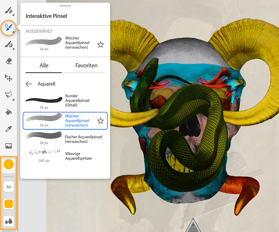Fresco bietet eine Vielfalt an Pinseln, mit denen Alejandro Farbe und Details zu seiner Collage hinzufügt. Unter „Interaktive Pinsel“ wählt er „Aquarell > Weicher Aquarellpinsel (verwaschen)“. Zum Bemalen der unterschiedlichen Teile der Collage passt er Farbe, Pinselgröße und Wasseranteil nach Bedarf an. Wenn er versehentlich über den Rand malt, greift er zum Radiergummi.