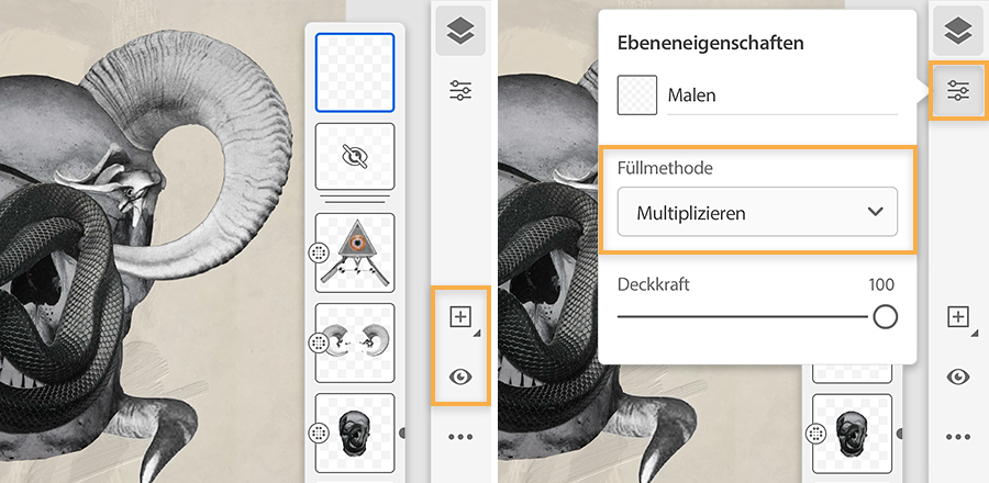 Durch Tippen auf die verborgenen Ebenen und dann auf die zugehörigen Augensymbole macht Alejandro alle anderen Grafiken sichtbar – mit Ausnahme der obersten Ebene. Dann wählt er die oberste Ebene aus und fügt eine neue Ebene hinzu. In den Ebeneneigenschaften legt er als Füllmethode „Multiplizieren“ fest. So bleiben die Bilder seiner Collage weiterhin erkennbar, wenn er auf der Ebene darüber malt oder zeichnet.