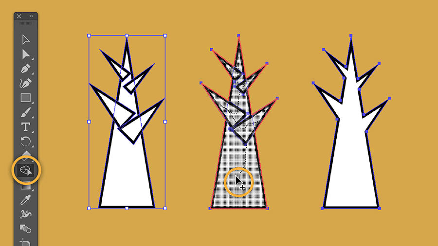 Genauso einfach lassen sich überlappende Formen wieder zerlegen und Teile davon entfernen. Wähle alle Formen aus. Klicke mit dem Formerstellung-Werkzeug auf die Teile der Form, die ausgestanzt, d. h. beibehalten, werden sollen. Auch wenn sich die Ansicht zunächst nicht verändert hat, ist die Form jetzt in ihre Einzelteile zerlegt.