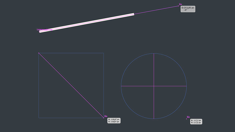 • Beim Zeichnen eines Quadrats wird eine diagonale Hilfslinie innerhalb des Objekts angezeigt.