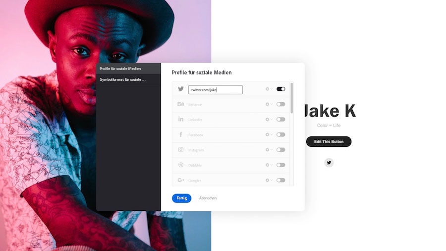 Entscheide dich für ein Layout, und lade ein Bild hoch. Füge weitere Informationen hinzu, z. B. Links zu Social-Media-Accounts oder eine Beschreibung deiner Person und deiner Arbeit.