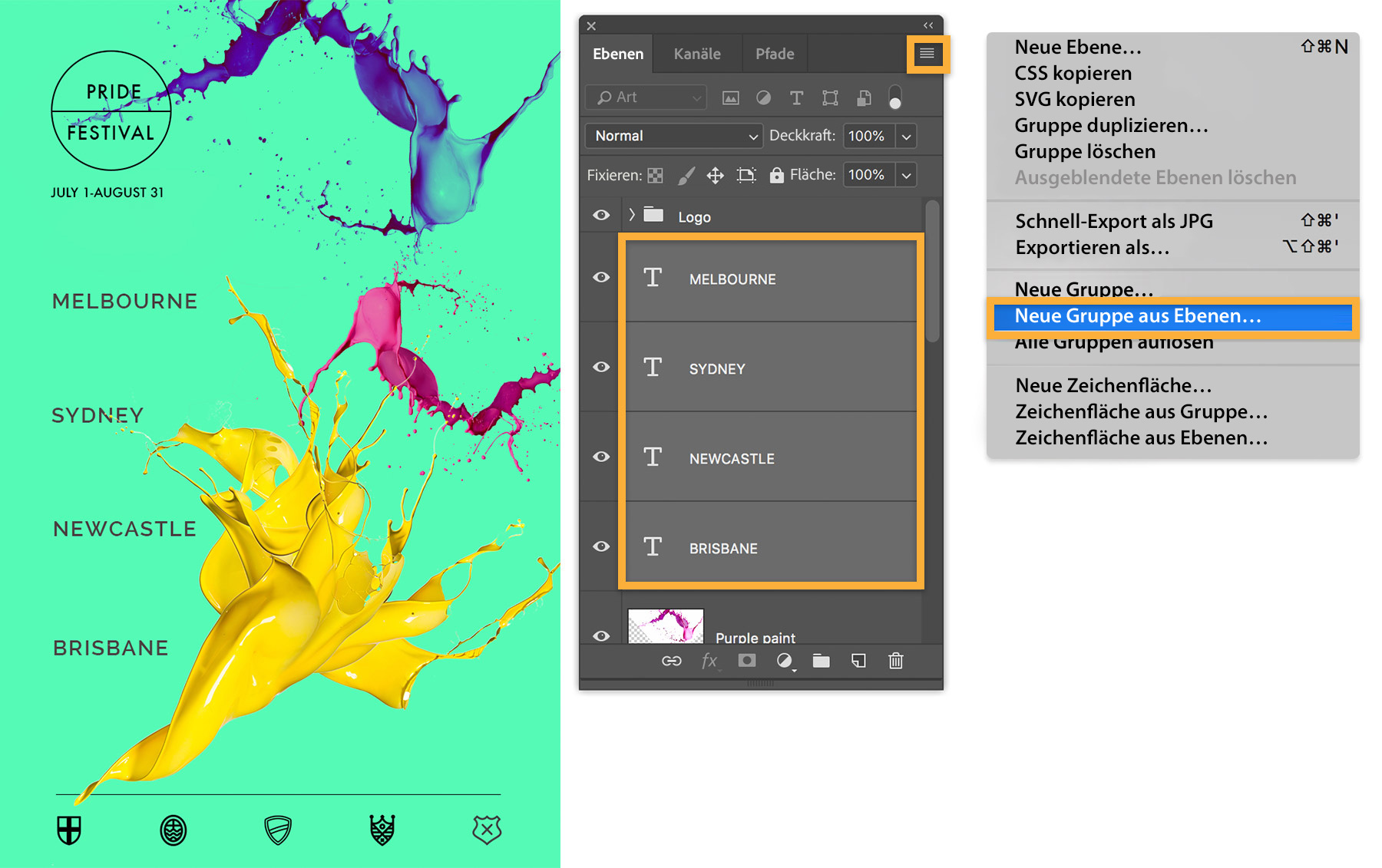 Wähle die vier Textebenen mit den Städtenamen aus (Melbourne, Sydney, Newcastle und Brisbane). Öffne das Menü des Bedienfelds „Ebenen“, und wähle „Neue Gruppe aus Ebenen“. Gib der Gruppe den Namen Cities.