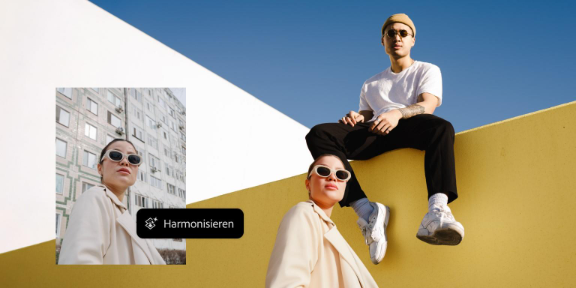 Die KI-gestützte Funktion „Harmonisieren“ zum Kombinieren von Bildern in Photoshop stimmt Licht, Schatten, Farbe und Ton des Motivs intelligent auf den Hintergrund ab. So kannst du Produkte in Lifestyle-Szenen einfügen oder Personen in einer neuen Umgebung platzieren und erhältst jedes Mal ein natürlich wirkendes Ergebnis.
