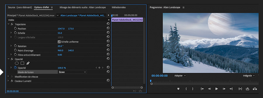 Recherchez la photo ou la vidéo d'un objet à insérer dans votre paysage surnaturel. Idéalement, trouvez un objet isolé sur fond noir ou transparent, afin de ne pas avoir à le masquer. Dans notre fichier d'exemple, nous avons choisi la planète Jupiter. Placez le métrage sur la piste située au-dessus de la vidéo d'arrière-plan et, dans la section Trajectoire du panneau Options d'effet (Maj + 5), ajustez ses valeurs Position, Échelle et Rotation jusqu'à ce que l'élément ajouté s'inscrive parfaitement dans la scène.
