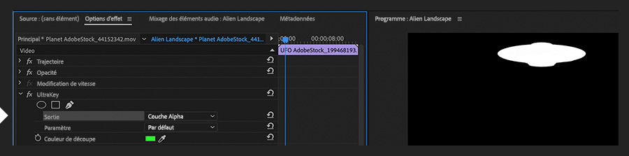 Pour vérifier la qualité de votre incrustation, dans le menu déroulant Sortie, sélectionnez Couche Alpha au lieu de Composite. L'objet que vous insérez doit être blanc uni (opaque) et l'arrière-plan noir uni (transparent). Toute zone de gris sera translucide. Revenez en arrière et modifiez les paramètres UltraKey pour les supprimer.
