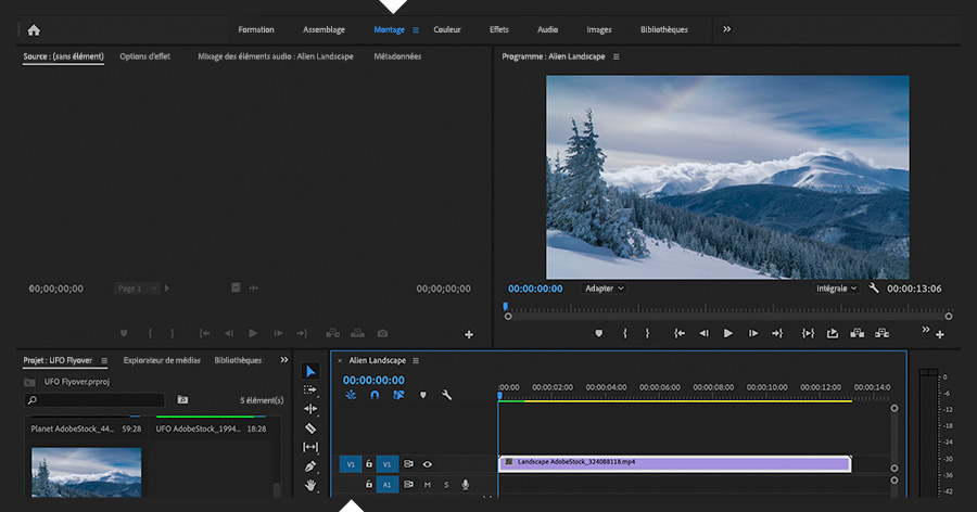 Dans le panneau Montage de l'espace de travail Montage, placez votre métrage d'arrière-plan sur la piste V1. Le ciel des plans de paysage offrent de grandes zones vierges pour laisser libre cours à votre créativité.