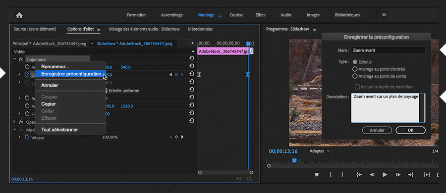 Créez rapidement des diaporamas animés dans Premiere Pro grâce aux paramètres prédéfinis personnalisés. Ces derniers permettent d'ajouter des effets de déplacement et de zoom dans des images fixes.