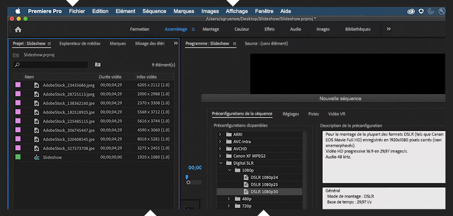 Dans l'espace de travail Assemblage (Fenêtre > Espaces de travail > Assemblage), importez toutes les photos (Fichier > Importer) à inclure dans votre diaporama. Sélectionnez Fichier > Nouveau > Séquence, puis dans la boîte de dialogue Nouvelle séquence, choisissez une préconfiguration Digital SLR. Notez que dans la colonne Infos vidéo du panneau Projet, la résolution de vos photos est probablement supérieure à celle de la séquence. Vous corrigerez cette anomalie ultérieurement.
