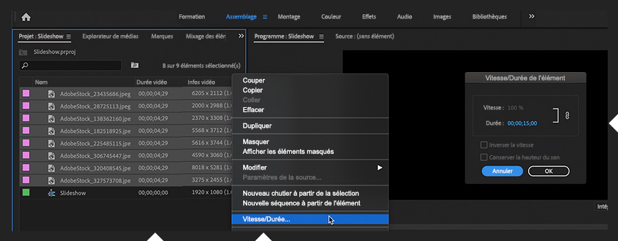 Par défaut, dans Premiere Pro, les images fixes sont affichées sous forme de séquences de cinq secondes. Si cette durée est trop courte pour votre diaporama, sélectionnez toutes les images dans le panneau Projet, cliquez dessus avec le bouton droit et sélectionnez Vitesse/Durée. Dans la boîte de dialogue Vitesse/Durée de l'élément, définissez la durée d'affichage souhaitée. Un rythme plus lent, par exemple, sera plus contemplatif, plus propice à la détente.