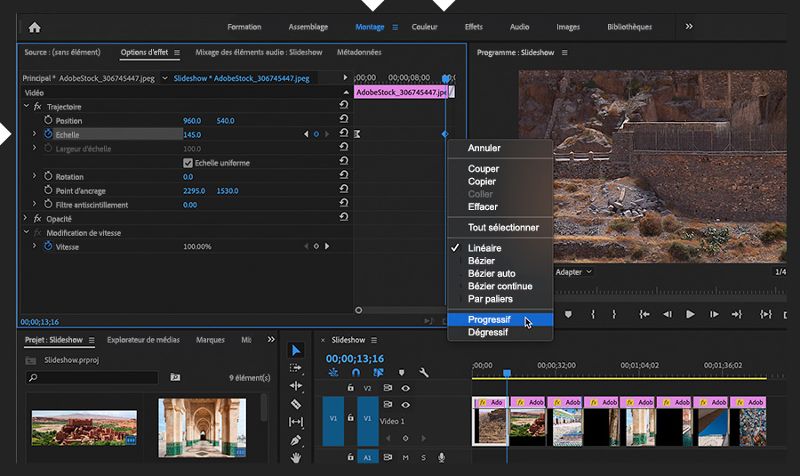 Passez dans l'espace de travail Montage et appuyez sur les touches Maj + 5 pour ouvrir le panneau Options d'effet. Appliquez un effet Ken Burns à une séquence. Pour effectuer un zoom avant, par exemple, ajoutez une image-clé Échelle sur toute la longueur de la séquence. Cliquez avec le bouton droit sur la première image-clé et choisissez Dégressif. Pour la seconde image-clé, choisissez Progressif. (Certaines propriétés peuvent nécessiter de sélectionner au préalable Interpolation temporelle.) Lancez la lecture de la séquence pour vérifier l'effet d'animation.