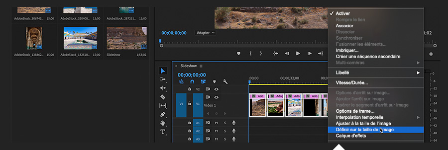 Comme indiqué précédemment, ces photos dépassent probablement les dimensions de votre séquence. Sélectionnez toutes les séquences dans le panneau Montage, cliquez dessus avec le bouton droit et choisissez Définir sur la taille de l'image. En adaptant automatiquement les séquences à la taille de l'image, vous pourrez ensuite les mettre à l'échelle sans nuire à la qualité d'image.