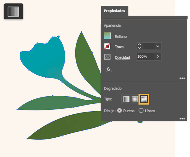 Haz clic en los puntos de la flor donde quieras añadir paradas de color y selecciona nuevos colores para cada una de ellas. Arrastra una parada para moverla y ver el efecto que tiene en las transiciones de color.