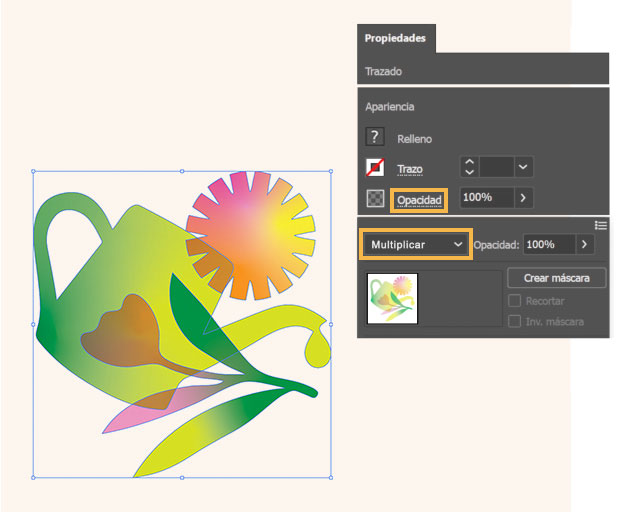 Utiliza la herramienta de selección para ensamblar las partes de tu logotipo. Haz clic en Opacidad en el panel Propiedades y cambia el modo de fusión a Multiplicar para cambiar la forma en que las capas interactúan y oscurecen los colores donde los objetos se superponen. Experimenta con otros modos de fusión para ver el resultado.