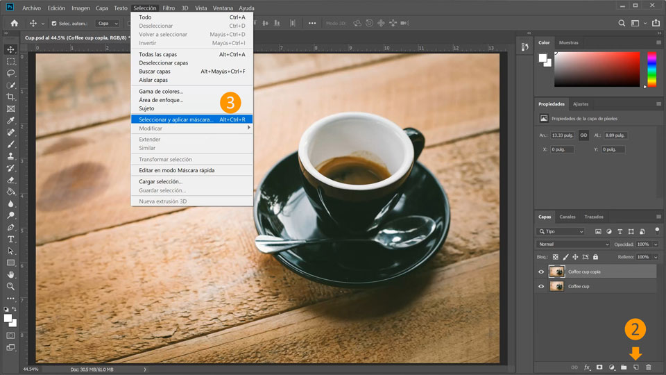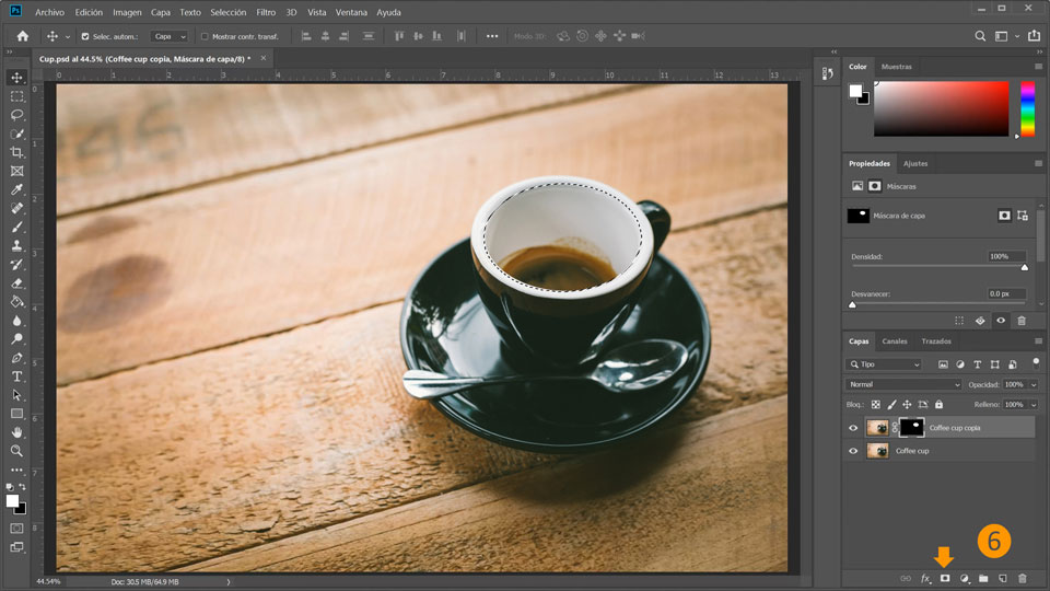 6. Partiendo de tu selección, añade una máscara de capa haciendo clic en el icono Añadir máscara de capa. La máscara se indica mediante un agujero blanco donde pintaste, en la capa Coffee cup copia (Taza de café copia).